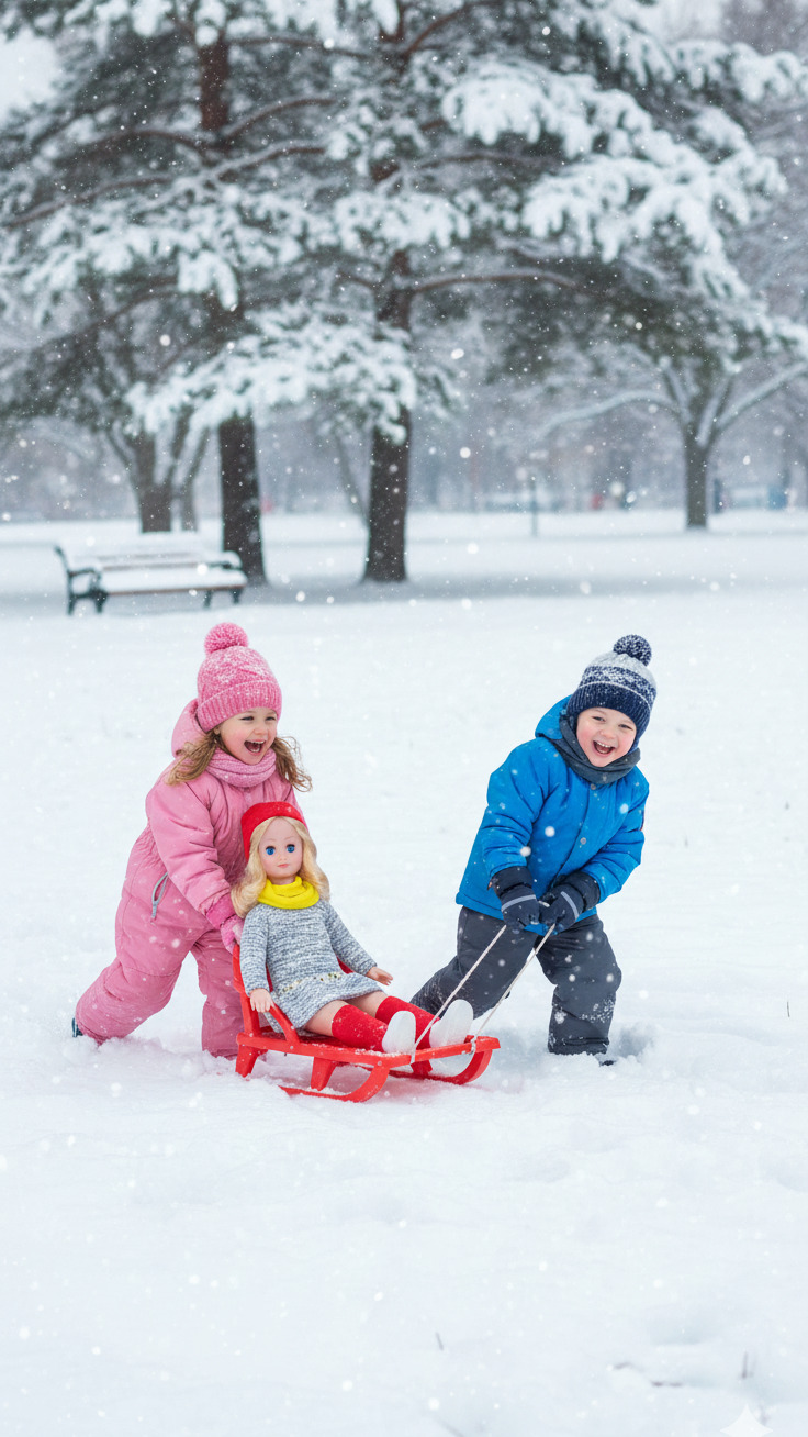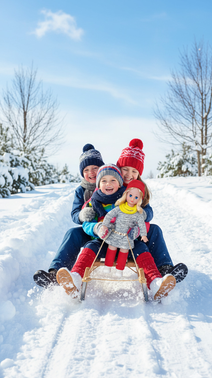 Платье/Туника: Кукла одета в длиннорукавное короткое платье или тунику. Ткань имеет узор, напоминающий мелкую серую или синюю крапинку на белом/светло-голубом фоне, создавая эффект текстуры или зимнего трикотажа.