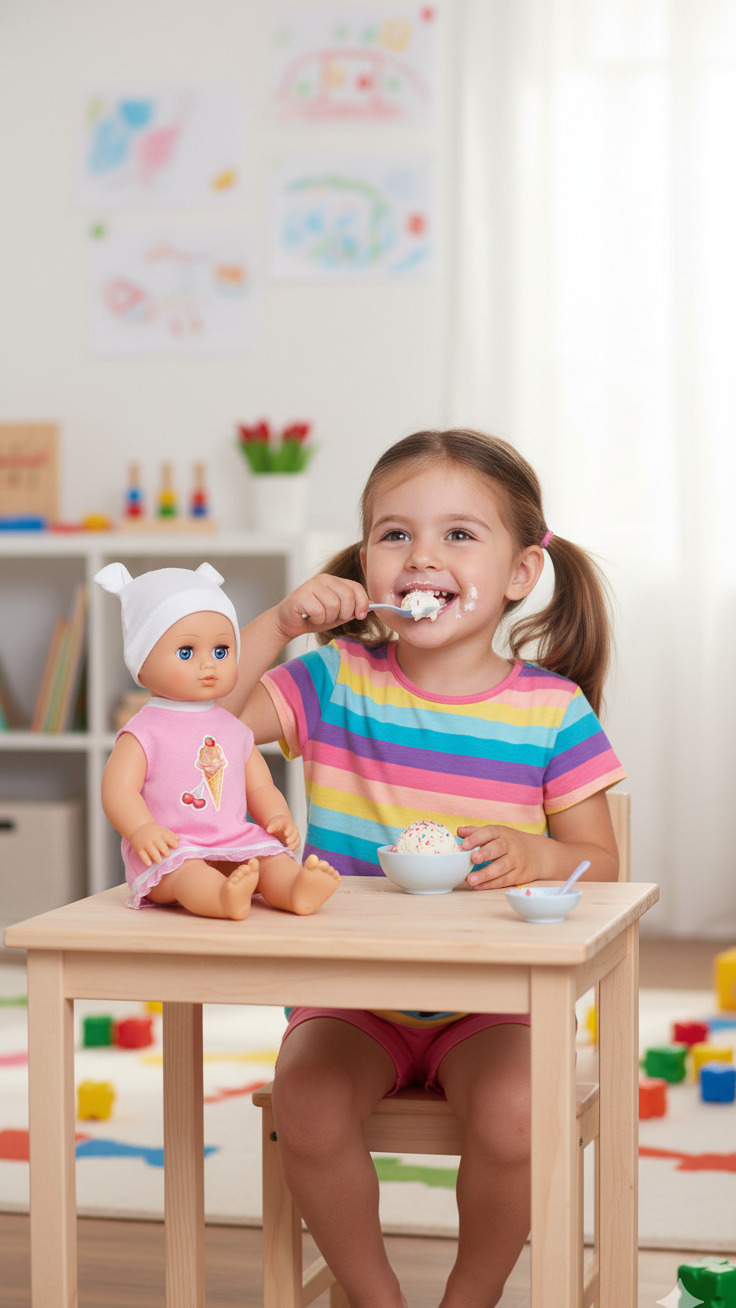 Перед нами кукла Леночка — маленькое воплощение нежности и летней радости. Она стоит, словно ожидая объятий, и готова подарить свою неповторимую, мягкую улыбку.Самое пленительное в Леночке — это её глаза: они распахнуты и сияют небесно-голубым светом. В них словно отражается безоблачный день, а влажный блеск делает взгляд невероятно живым. Черты её лица нежны и аккуратны, а на пухлых щечках разлился персиковый румянец — знак здорового сна и сладких мечтаний. Маленький, слегка приоткрытый ротик придает ей удивленно-наивное выражение. На головке Леночки уютно устроилась белоснежная трикотажная шапочка. Ее особенность — два задорных, стоящих торчком ушка, превращающих Леночку в маленького милого зайчонка или котенка. Она одета в воздушное, нежно-розовое платьице-тунику. Цвет платья напоминает закат на летнем небе или сладкую клубничную пенку.В самом центре наряда расположен аппетитный и радостный принт: вафельный рожок с шоколадным мороженым, украшенный яркой спелой клубникой, а рядом, словно подружки, висят две глянцевые красные вишенки-близнецы. Этот рисунок делает образ невероятно вкусным и ассоциируется с беззаботным летом. Подол платьица изящно оторочен тонкой белой лентой и волнистым кружевом, добавляя образу легкости и деликатности.У Леночки мягкие, округлые ручки и ножки настоящего пухлого малыша. Она стоит босиком, демонстрируя свою непосредственность и готовность играть, топая по теплому полу.Леночка — это кукла, которую хочется прижать к себе. Она излучает тепло, безмятежность и сладость, как само лакомство, изображенное на её наряде. Это идеальный компаньон для самых добрых и нежных игр.
