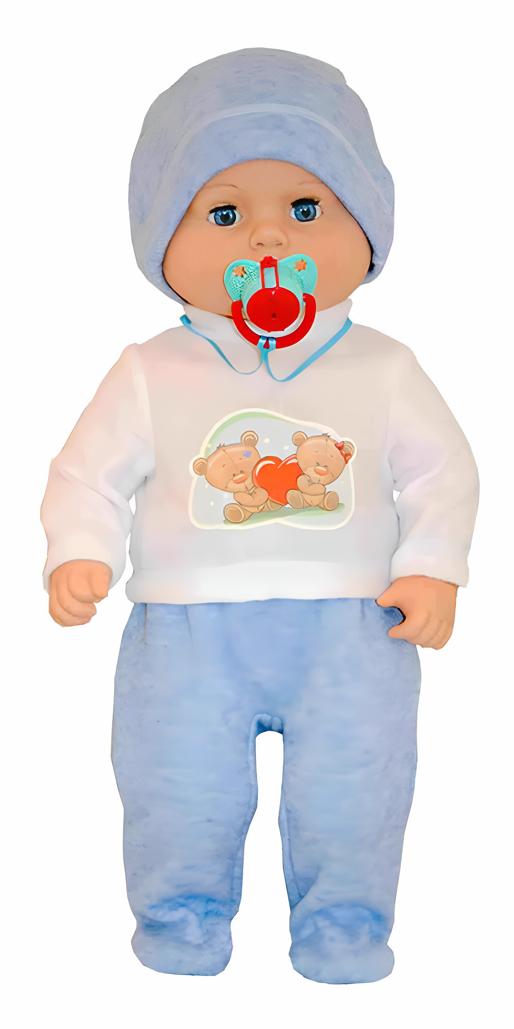 - Кукла с пустышкой. При снятии крышки и нажатии на пустышку произносятся приятные звуки похожие на детский лепет.